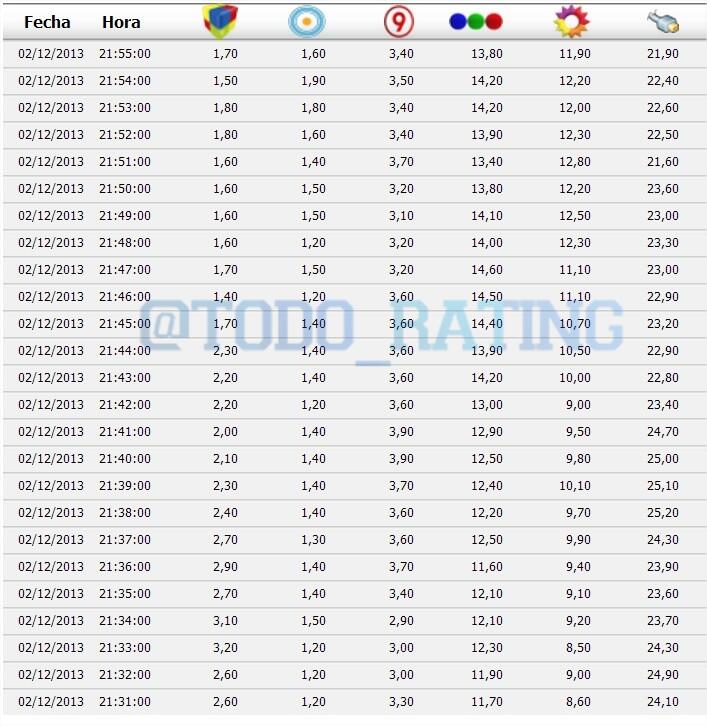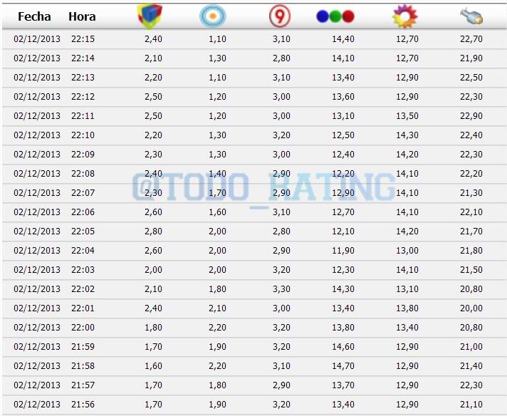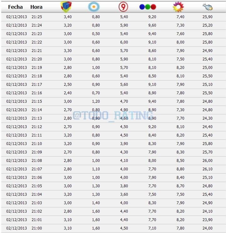 A Las 22:23Hs. El Trece - "Soñando por Cantar" 20.0 Telefe - "El Hombre de tu Vida" 12.0 A Las 22:24Hs. El Trece - ...